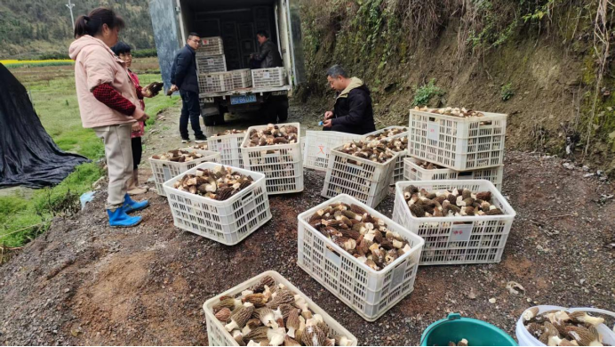 在客寨村和夕东村的羊肚菌种植大棚内,湿润的泥土气息扑面而来。一垄垄菌床上,褐色的羊肚菌长势喜人,密密匝匝探出头来。村民们手持剪刀,穿梭于菌垄之间,熟练地采收成熟的菌菇,一筐筐鲜菇被迅速装运出场。